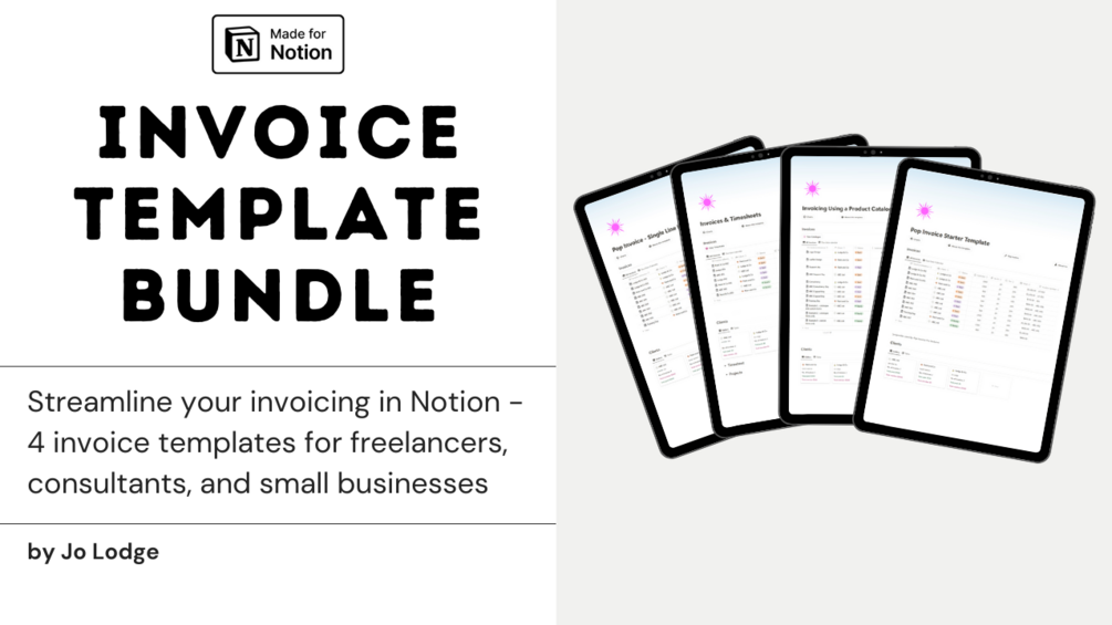 This set of templates includes four invoice templates for Notion, each designed to help you create, organise, and track invoices. Tailored for different use cases, you can manage single-line invoices, track time spent on projects, or create invoices from a product catalogue.